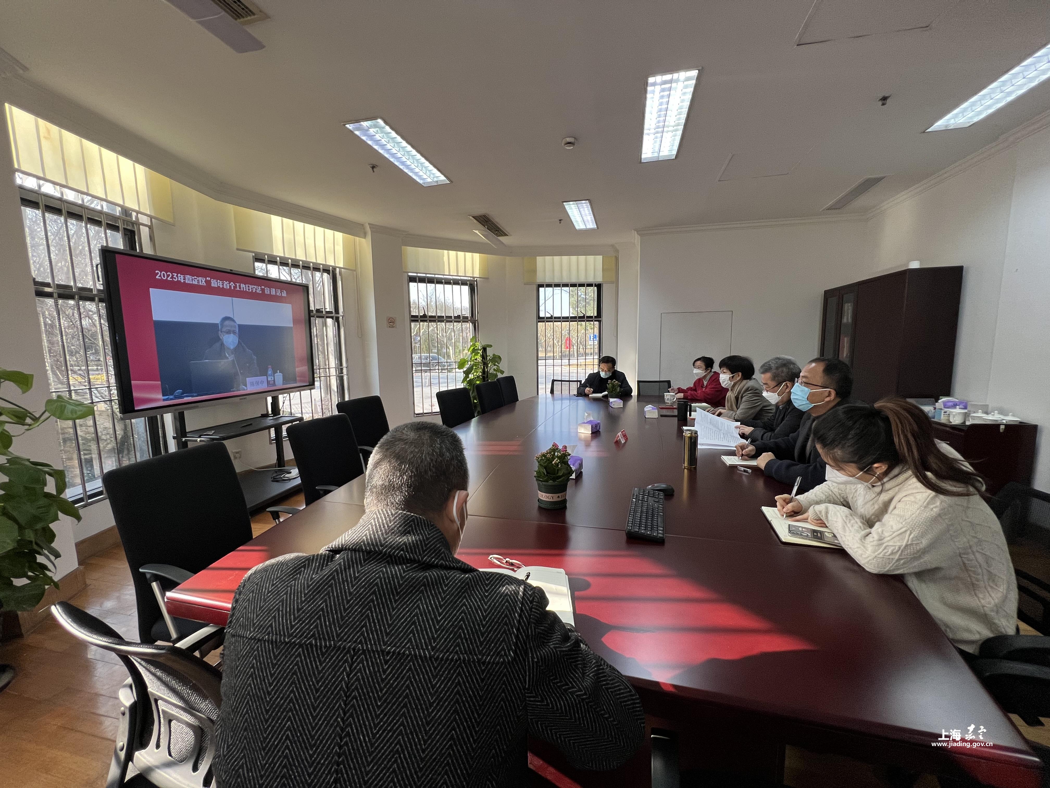 为继续深入学习党的二十大精神,贯彻习近平法治思想,做好领导干部带头学法工作,在2023年1月3日,首个工作日上午,嘉定区民防办组织全体工作人员,参加中共嘉定区委依法治区办、区委宣传部、区法宣办、区法学会举办的嘉定区“新年首个工作日学法”宣讲活动。
