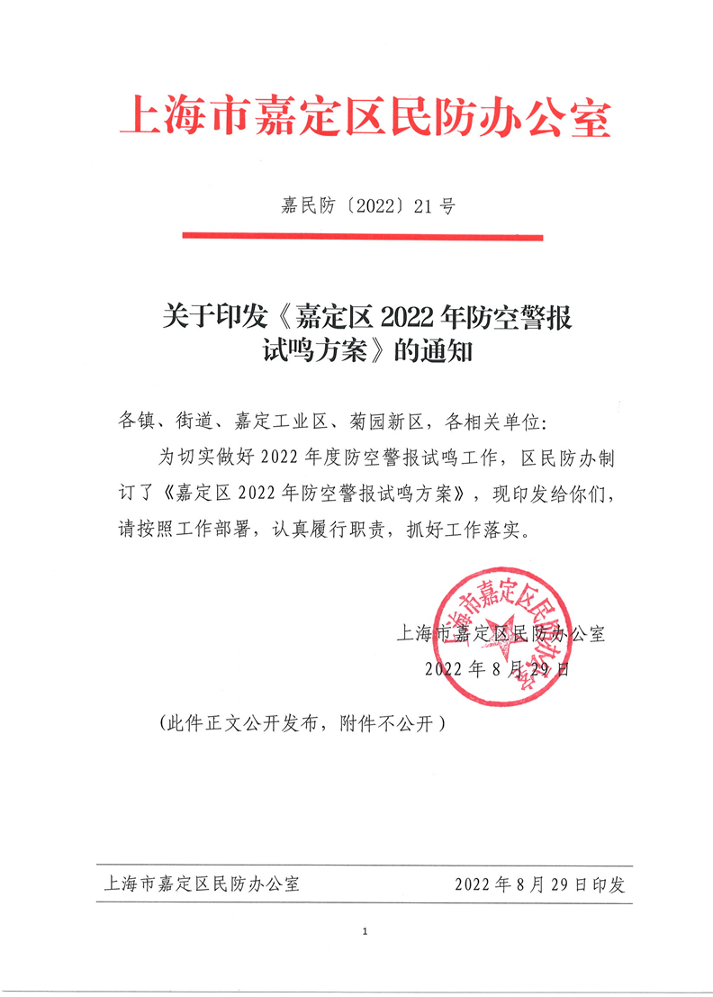 关于印发《嘉定区2022年防空警报试鸣方案》的通知
