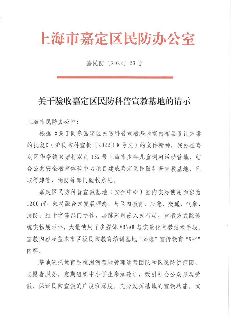 根据《关于同意嘉定区民防科普宣教基地室内布展设计方案的批复》(沪民防科宣批〔2022〕8号文)的文件精神,我办在嘉定区华亭镇双塘村双浏132号上海市少年儿童浏河活动营地,结合公共安全教育体验中心项目建成嘉定区民防科普宣教基地,已取得建管、消防等部门验收意见。