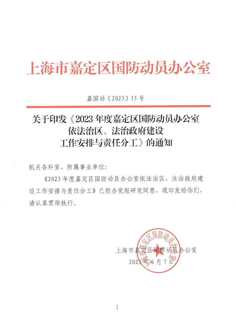 关于印发《2023年度嘉定区国防动员办公室依法治区、法治政府建设工作安排与责任分工》的通知