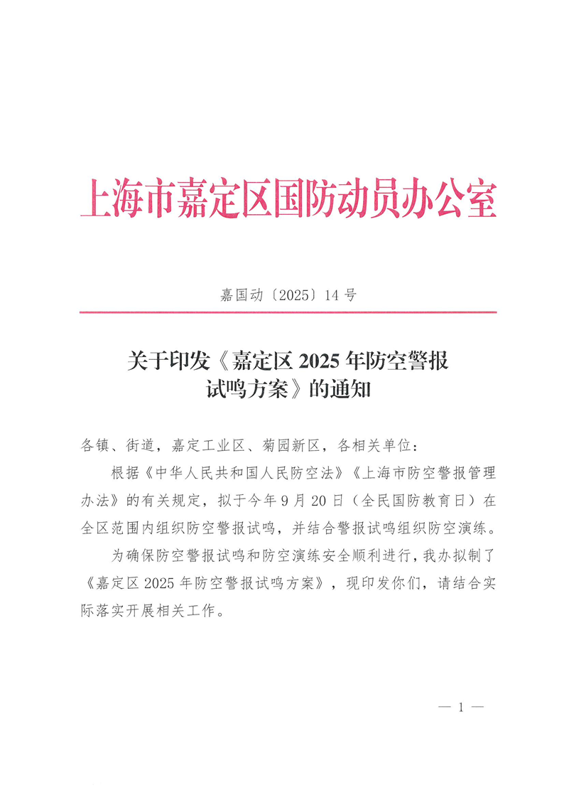 为确保防空警报试鸣和防空演练安全顺利进行,我办拟制了《嘉定区2025年防空警报试鸣方案》,现印发你们,请结合实际落实开展相关工作。